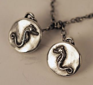 Two 5/8 inch discs with seahorses on either end of a 22 inch chain, meant to be looped and hung at varying heights—
