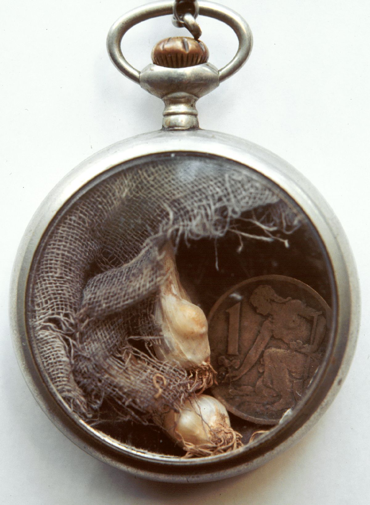 Woman Planting, (fabric, dirt, coin, onion bulbs) (not available) —