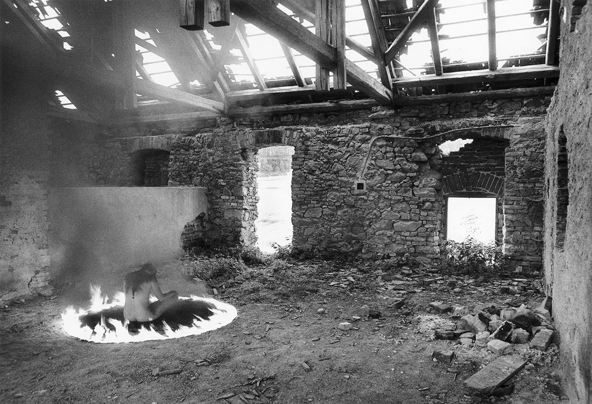 Seated in a circle of fire, McDonald hunches forward, her back covered in ash; she is surrounded by the skeleton of a decaying building, and it seems everything will soon collapse around her. Elsewhere, she lies nearly naked beneath a giant saw blade that runs the length of her body; if the blade were to drop she would be split wide open. Quietly shrouded in cobwebs, she lies in the corner of an abandoned room where feathers float from the ceiling; a tiny pair of wings spreads from her shoulders. As a human chrysalis, she gives no clues as to whether she is entering or leaving this world. Instead, she entices us into an eerie state of limbo. Throughout McDonald's images there is a constant sense of a world in which things have begun to fall apart and transform long ago. I can almost smell the dust and mold in the factories and rooms, and feel the dampness peeling layers from the walls. But beneath this is a sense of life so unquestioning and persistent that it shakes each image alive. That aliveness launches itself outward as a yearning. It is as if the selves portrayed here are trying to break through the external—buildings, the body, even nature—to reach the spirit. They would rather let go of what is familiar and safe, including the physical world around them, than risk silencing this. And isn't it true that as human beings we often hold on so tightly to who and what it is that we think we are that we are constantly in danger of suffocating ourselves. Days and years go by and over time it feels as if there is nothing left inside once we have met, or have tried to meet, the flood of requirements and responsibilities that surround us. To stay afloat, what we hold onto, in some cases for a lifetime, is a vacated shell. We no longer listen to or dwell in our dreams, desires, and imagination, which are our animating forces; and the cost of not doing so is great. We lose sight of our capacity for transformation and unlimited becoming. What would happen if we let our spirit have its way with us? McDonald challenges us to bring this range of expression and emotion into broad daylight and to look at it again and again as a way of staying alive.